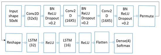 Therefore, the network takes a stream of samples as input. Each sample is a set of different eye movement features, such as direction, velocity, and their higher-order derivatives. The stream of samples is analyzed in windows of 50 samples (which gives a time span of 100 ms in our dataset). To obtain a prediction for each sample, the window moves over the sequence one by one, and the sample in the middle of the window is classified according to the neighboring samples. The network comprises different layers, precisely three convolutional layers with 32, 16, and 16 filters and a kernel size of 5. After the convolutional layers, a permute function reshapes the CONV2D output into an LSTM input shape, two LSTM layers with 32 and 16 units, batch normalization layers, and a dense output layer. A sequence of samples with a shape of , where N is the number of features for each feature’s combination, serves as the input to the network. The network architecture is shown in Figure 1.