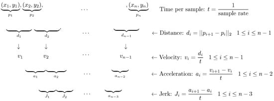 Because different features were important in classifying different events, tests were performed to verify which combination of features gave the best event detection results. Velocity, acceleration, and jerk were calculated from the raw x, y, coordinates, as shown in Figure 2, while the direction was calculated as shown in Equation (1).