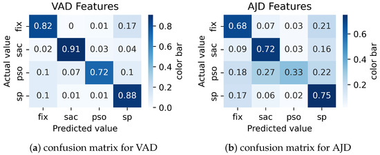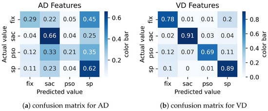 The confusion matrix analysis for the combinations of AD and VD features is shown in Figure 4a and Figure 4b, respectively. Each row in the matrices shows the percentage of samples for a given event that were classified as the event shown in the corresponding column. The results for the AD combination clearly show that fixations and smooth pursuits are often confused (45% of fixations are classified as smooth pursuits). Moreover, the recall of PSOs is very low, and most of the actual PSOs are misclassified (only 21% are classified correctly).
