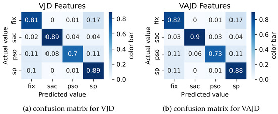 Combining velocity and direction with acceleration and/or jerk improved the overall identification performance for all event types compared to other feature combinations, especially for PSO detection. However, the performance of PSO identification is still low, and many PSO points are misclassified as fixations and smooth pursuits. The results for these feature combinations are shown in Figure 5. For example, the results of the VAJD feature combination in Figure 5b show that 11% of PSOs are misclassified as smooth pursuits and 11% as fixations. The VAD and VJD feature combinations perform approximately the same as VAJD.
