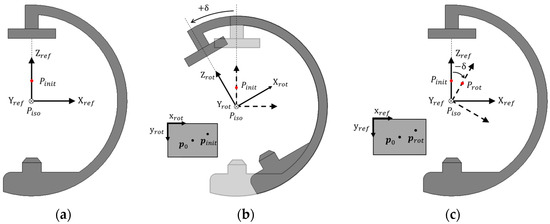 In previous studies, the origin of the 3D coordinate system of the C-arm is located at the focal spot. Therefore, the rotation of the C-arm is equivalent to the translation and rotation of the focal spot. As shown in Figure 2a, the initial 3D coordinate system of the C-arm with a rotation angle of 0, where the isocenter (Piso) is the origin and the Z-axis is parallel to the principal line (L0), is defined as Cref. We assume that a point Pinit exists in the C-arm workspace. When the C-arm rotates by δ about Piso, as shown in Figure 2b, the rotated 3D coordinate system of the C-arm is defined by Crot, of which the origin is also located at the Piso and the position of Pinit can be calculated with respect to Crot. On the other hand, if the Cref is fixed and Pinit rotates by -δ about the Piso, as shown in Figure 2c, we can define this rotated point as Prot. The position of Prot can be calculated with respect to Cref. The position of Pinit and Prot in Crot and Cref are same, as shown in Figure 2b,c. Therefore, the images captured from each view should be identical. Consequently, the translation and rotation of the focal spots can be described solely by the rotation of an object about the Piso in the fixed coordinate system by defining the Piso as an origin of the 3D coordinate system of the C-arm. At this point, we do not consider the translation of the imaging equipment.
