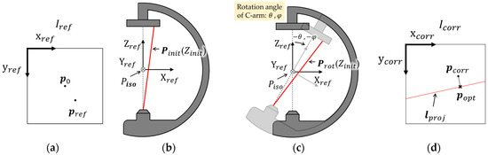 In this section, we explain the detailed method to reconstruct the 3D coordinates from the two X-ray images. When two X-ray images are captured from different views, Vref is the reference view obtained without rotating the C-arm and Vcorr is the corresponding view obtained with rotating the C-arm. The 3D coordinates of Vref are described with respect to Cref. The 2D X-ray images captured from each view are Iref and Icorr, and are depicted in Figure 3a,d. The projected pixel points of P in 3D space onto Iref and Icorr are denoted as pref and pcorr. The coordinates of the principal points in Iref and Icorr are defined as p0. Figure 3a shows pref and p0 in Iref. The 3D coordinates of Pinit = [Xinit Yinit Zinit]T in Cref corresponding to pref can be derived utilizing (4), as shown in Figure 3a,b.