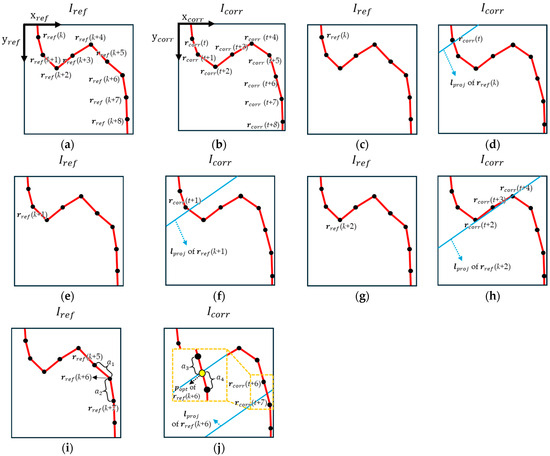 Figure 4e,f depicts the case where only one point of rcorr meets the distance constraint. If the index of this rcorr point, rcorr(t + 1), is greater than t (the index of the previously assigned popt), then rcorr(t + 1) is designated as popt for rref(k + 1). However, if the index of rcorr(t + 1) is less than or equal to t, popt corresponding to rref(k + 1) cannot be determined. Figure 4g,h illustrates the case where multiple points of rcorr satisfy the distance constraint. The points of rcorr that satisfy the distance constraint with lproj of rref(k + 2) are rcorr(t + 2), rcorr(t + 3), and rcorr(t + 4). The point with the smallest index greater than the previously assigned indices (t, t + 1) is selected as popt, which is rcorr(t + 2). Likewise, if the index of rcorr(t + 2) is less than or equal to t or t + 1, popt corresponding to rref(k + 2) cannot be determined. Similarly, if no rcorr points satisfy the distance constraint, as shown in Figure 4i,j, popt cannot be assigned. After assigning popt to all rref points, the points rref which have popt are classified as Group 1 and the points rref which do not have popt are classified as Group 2. The points popt for Group 2 are assigned using the interpolation method. Figure 4i,j illustrates the process for determining popt for rref(k + 6) of Group 2 due to the absence of rcorr satisfying the distance constraint. rref(k + 5) and rref(k + 7) belong to Group 1, and if their popt are rcorr(t + 6) and rcorr(t + 7), respectively, then popt for rref(k + 6) is selected from the point lying on the line connecting rcorr(t + 6) and rcorr(t + 7) in such a way that the ratio of the number of pixels between rref(k + 5) and rref(k + 6) (a1) to the number of pixels between rref(k + 6) and rref(k + 7) (a2) is equal to the ratio of the number of pixels between rcorr(t + 6) and popt (a3) to the number of pixels between rcorr(t + 7) and popt (a4).
