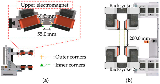 Corners of the upper electromagnets of the RAMAN system utilized as corresponding points: (a) side view; and (b) top view.