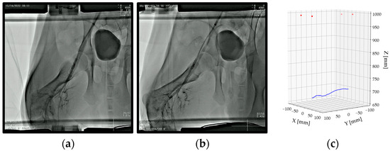Before the main procedure, the SRMR attached to the delivery catheter was inserted near the target lesion by the feeding device. Then, the C-arm was rotated by RAO 15° (𝔸15°,0°) or LAO 15 ° (𝔸−15°,0°), and a contrast agent was injected into the vessels to capture Icorr. The C-arm was then rotated to the AP view, and a contrast agent was injected again to capture Iref. The pixel coordinates of the four corners were detected using the vision assistant module of LabVIEW from the captured Iref and Icorr. Then, the relative rotational angles between the two views () were calculated utilizing the proposed method in Section 2.4, and were and , and the average distance errors between the four corresponding points were 0.341 mm and 0.324 mm, respectively. Also, 3D coordinates of the corresponding points were calculated in Cref. Subsequently, the contour of the vessel where an SRMR will be operated was manually selected from Iref and Icorr, and the centerlines of the blood vessel were enhanced by skeletonization in Iref and Icorr. Finally, the 3D coordinates of a blood vessel’s centerline were calculated in the Cref using the calculated relative rotation angles and the method proposed in Section 2.5 and were then transformed into the 3D coordinate system of the MNS workspace by considering the calculated coordinates of the four corresponding points. Once two 2D X-ray images are ready, it takes 18.7 s in a computer with an Intel Core i7-11700KF CPU (Intel, Santa Clara, CA, USA), 32 GB DDR4 RAM, and an NVIDIA GeForce GTX 760 GPU (NVIDIA, Santa Clara, CA, USA) to compute the 3D coordinates of 596 points.