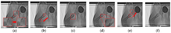 In vitro experiment along the right SFA using the RAMAN system, feeding robot, and SRMR after generating a 3D blood vessel map. (a) Separation; (b) movement forward; (c) balloon inflation; (d) movement backward; (e) recombination; and (f) final retrieval.