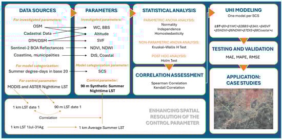 This methodology assesses the relationship between each selected parameter and nighttime surface temperature, specifically to the 90 m synthetic average summer LST at night. Below, we detail the data sources for parameter computation, followed by the statistical and correlation analyses conducted using the R programming language (v.4.3.0).