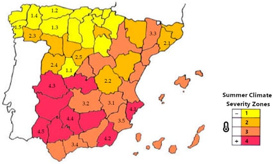 The inclusion of a climate severity metric is grounded in prior efforts to quantify summer thermal stress and its effects on urban systems. One of the earliest anthropocentric indices [] was originally developed for the northeastern United States, though its global applicability remains unverified. In Europe, a Climatic Severity Index was proposed [] to define summer climatic zones in Italy, linking them directly to air conditioning energy demand in buildings. In a similar manner, the Spanish Building Code (CTE) introduced a classification of summer climatic zones in the Iberian Peninsula based on accumulated summer degree-days. This national-level approach provides a standardized, regulation-backed index for quantifying summer climatic severity, which serves as the foundation for the SCS used in this study.