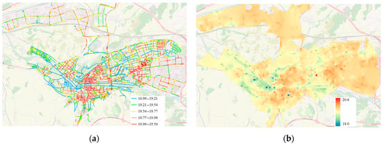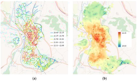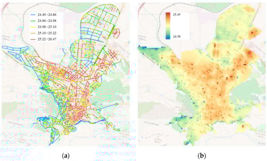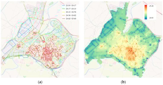 This study calculates Land Surface Temperature (LST) at the road segment level, using 50 m road sections as analytical units to integrate morphological and environmental assessments. LST is considered as a sign of a UHI, being a parameter that measures its expression, Surface Urban Heat Island (SUHI) []. Roads are considered in this work as a measurement unit due to their extensive urban presence and their role in thermal dynamics. Specifically, roads can be used as containers of the surrounding morphological and environmental conditions. This structured approach enables a standardized evaluation of localized heat accumulation and its contribution to UHIs, positioning streets as key spaces for large-scale mitigation measures.