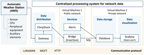 An architecture divided into five layers is presented, ranging from the AWSs to the internal VM. The network of AWSs captures and sends data to a central node, from where users can consult the data. This data transfer is carried out using LoRaWAN technology, a long-range, low energy consumption open-source protocol [63]. In addition, it provides high data transmission security by encrypting packets at the network and application level, which means that the measuring devices can only be read by authorized servers that have registered the devices with their corresponding keys (Figure 1).