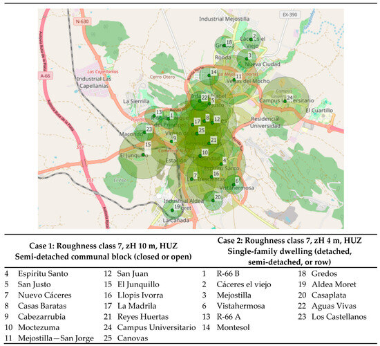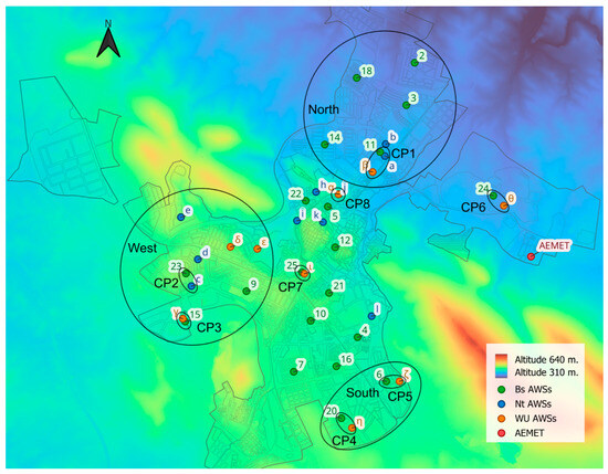 On the one hand, a bespoke network was studied. This is made up of 25 AWSs and was deployed in July 2024 by researchers from the Polytechnic School of Cáceres as part of the project Heat Waves and Cities: Adaptation and Resilience of the Built Environment [53]. One of the principal specific objectives was the digital modeling of the city through low-cost, open-source, and continuous monitoring.