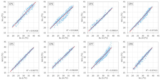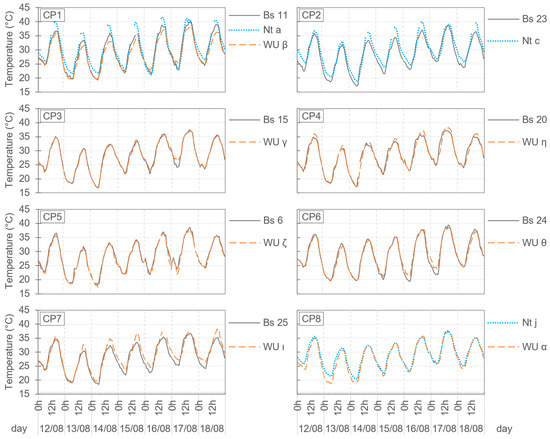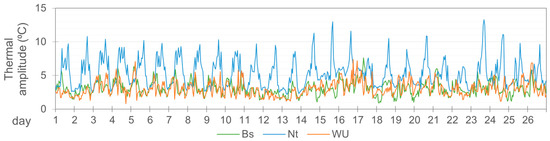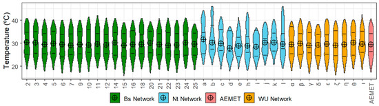 A comparative analysis is then carried out of the hourly thermal records from the meteorological stations of the three networks over the same period, on the understanding that the said records correspond directly to the accumulated urban heat (Section 5). The analysis of relative humidity records was excluded from this study, not a commonly used variable in the scientific literature [45,61,62]. Furthermore, it does not significantly impact climate comfort within the context of this case study. Before carrying out the data analysis, a quality control was performed to locate those values that could possibly be considered anomalous due to isolated errors in the measuring systems and also to evaluate the consistency and uniformity of the data in the entire set of each of the networks. The analysis was carried out considering two different scenarios: first, by checking the coherence of the data between the networks through the definition of the control points, i.e., through the nearby stations belonging to the different networks (an average distance of 160 m and a maximum of 300 m), and the analysis was later contextualized within a typical period of seven days; second, by differentiating between the control zones (UCZ corresponding to the local scale, i.e., HUZ) with similar topographical altitudes and vegetation that have a sufficient density of AWSs in all three networks; in this case, a typical sub-period of seven days within the general period was used. This work allows the quality of the registers to be known, and the variability of the data obtained to be evaluated according to whether they come from one network or another.