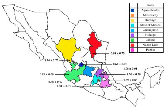 Geographical distribution of AFM1 concentrations (μg/L) in commercial CM samples collected in Mexico. Data is presented as mean ± standard deviation.