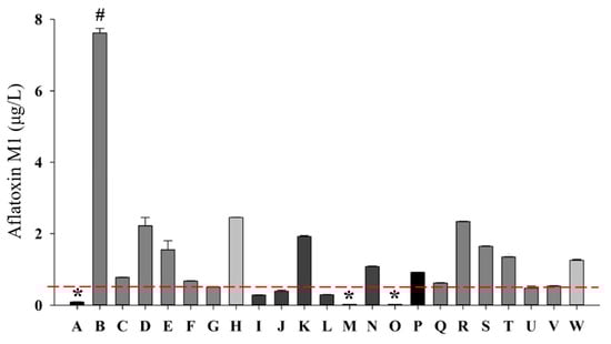Quantification and identification of AFM1 by liquid chromatography in commercial milk. AFM1 μg/L: micrograms per liter of aflatoxin M1; A–W: cow’s milk; # indicates a statistically higher value compared to samples analyzed; * indicates a statistically lowest value compared to the samples. The red horizontal line indicates the maximum limit set by the Mexican standard NOM-243-SSA1-2010 (0.5 μg/L).