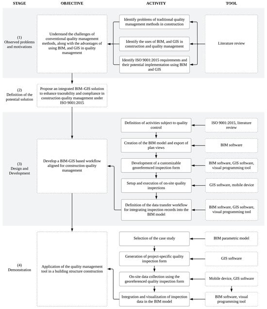 The article is organized as follows: Section 2 presents the stages of the research methodology. Section 3 presents the state of the art of quality management, BIM, and GIS. Section 4 presents the workflow followed for the development of the tool. Section 5 presents the details of the case study and the results obtained. Section 6 presents the discussion. Section 7 presents the conclusions.