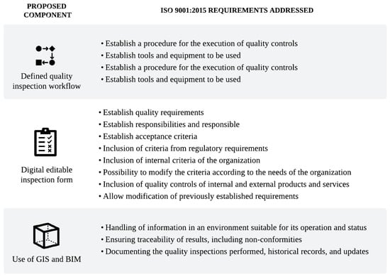 The development of QualiSite focuses on supporting the fulfillment of requirements present in ISO 9001:2015 for the definition of a QMS [15]. Three fundamental aspects were defined to support the development of the quality management tool. These include the following: (1) a defined workflow for quality inspection, (2) the digitization of inspection data collected in the field, and (3) the use of GIS and BIM models in the storage, management, and visualization of quality information.