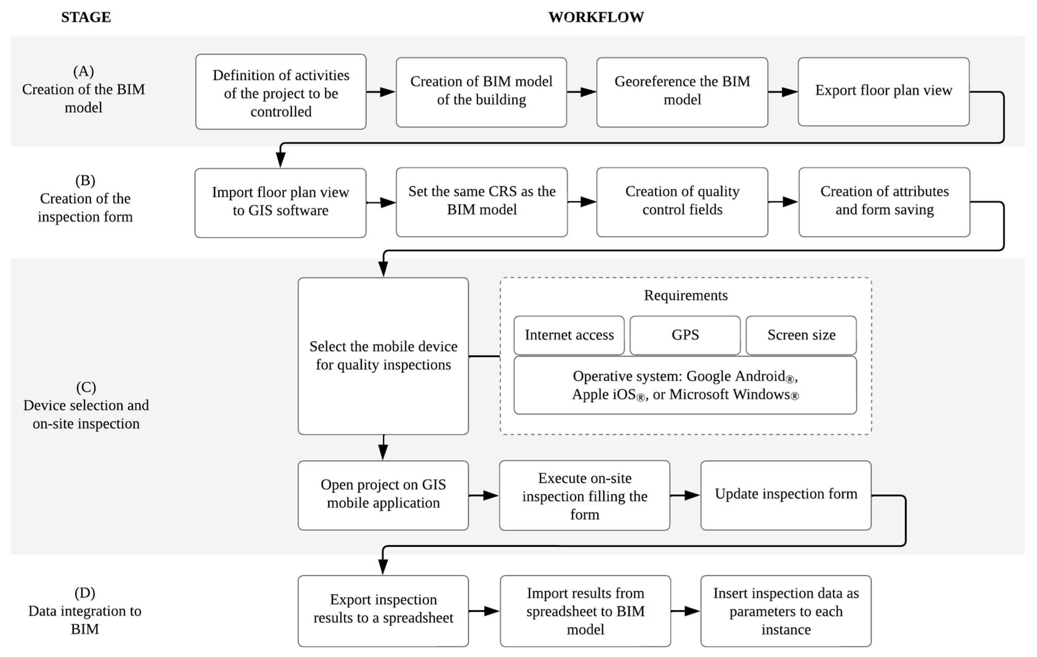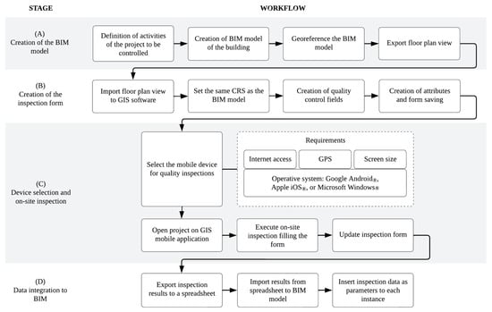 The third stage focused on translating the conceptual model into an operational workflow. This included selecting applicable ISO 9001:2015 requirements for on-site quality control, developing a customizable georeferenced inspection form adaptable to different projects, and setting up the mobile tools and procedures required to perform on-site quality inspections. Additionally, the data transfer workflow was defined to enable the integration of inspection results into the BIM model. The implementation of this workflow used GIS platforms, mobile devices, and visual programming tools to automate the insertion and visualization of quality data within the digital model.