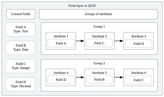 The inspection form for quality control was developed using QGIS software. Starting from the georeferenced BIM model, a plan view in DXF format was imported as a new geopackage layer and configured with the same CRS. This layer allows the creation of control points, each associated with customizable fields defined by the user, including text, dates, and numerical inputs. These fields are grouped into quality attributes, which structure the form according to the control phases of the project. The configuration also allows dropdown menus and display ordering. Figure 4 shows a reference of the field and attribute setup. Once completed, the QGIS file is synchronized with QFieldCloud using the QField Sync plugin, enabling access to the inspection form from a mobile device.