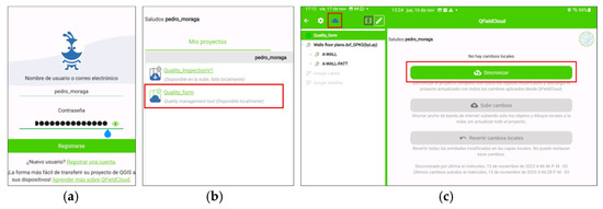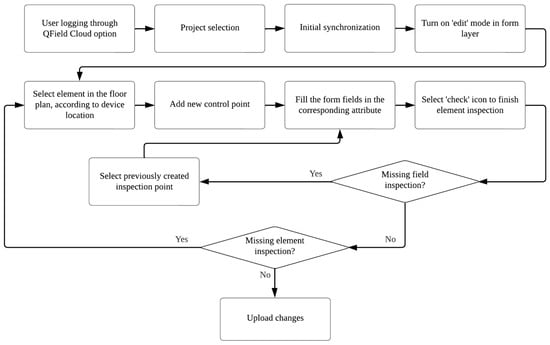 Once the inspector logs in to the QField application and synchronizes the project, the inspection begins by activating the editing mode of the inspection layer. The operator selects the elements to be inspected directly from the floor plan view and adds new control points at their physical location. The GPS continuously updates the inspector’s position, allowing accurate spatial association between the control point and the actual element. The inspector completes the form for each control point by filling out the fields grouped under the relevant quality attributes. The system also allows the inspector to return to previously created control points to make necessary corrections or updates. After completing the inspection of all required elements, the operator selects the “upload changes” option, which updates the QGIS file with the collected data. This information can then be accessed from a computer to continue the quality control process. Figure 5 summarizes the overall workflow for field inspection using QField.