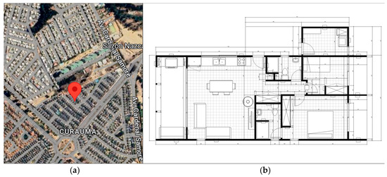 The selected case study corresponds to a house in Curauma, Valparaíso, Chile. Its configuration is a single level with a surface area of 96 m2, and its design is based on the construction of a reinforced concrete wall system. Figure 6a shows its location on the map, and Figure 6b, shows the floor plan drawings with the distribution of the components.