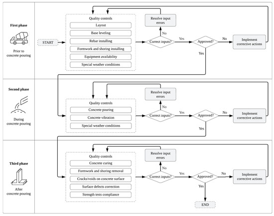The quality controls were applied to the construction of all reinforced concrete walls. The requirements were defined based on [82], which outlines procedures following Chilean construction standards. Three inspection phases were established: prior to concrete pouring, during pouring, and after pouring. Each phase includes specific quality verification tasks related to geometry, materials, execution methods, and performance criteria. A breakdown of these activities is presented in Table A1. Each phase must be approved before proceeding to the next, ensuring that all activities comply with the established quality requirements. In cases of non-compliance, corrective actions must be documented and subsequently revalidated. Before approval, the inspector must manually review the inspection data to confirm that all entries are complete, coherent, and consistent, thereby minimizing the risk of input errors. Figure 7 provides a diagram that summarizes the order of execution of the controls in each of the three phases contemplated.