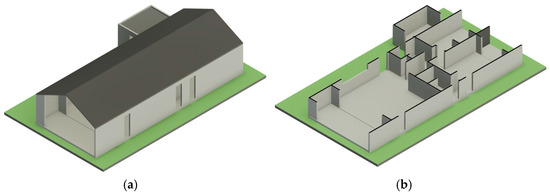 BIM model generated for the case study: (a) 3D view of the entire house, (b) 3D section view.