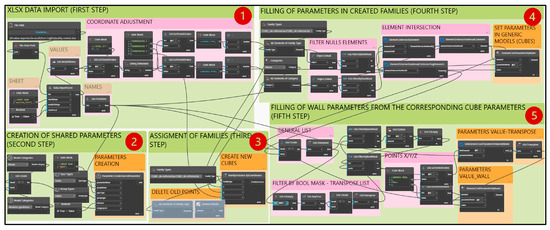 The final stage of the process involves integrating the inspection data collected on-site into the BIM model using Dynamo, a visual programming environment included in Revit [79,80]. This step facilitates the direct embedding of information gathered from the field into the parametric elements of the digital model. Once the inspection form has been completed and synchronized via QFieldCloud, the updated QGIS file is exported in XLSX format. This spreadsheet contains the inspection results associated with each control point. Dynamo then automates the process of incorporating these data into the BIM model through the following tasks [81]:
