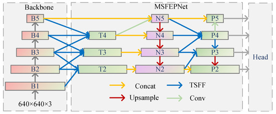 To address these issues, this paper introduces a novel multi-scale feature extraction network MSFENet, which integrates a tiered scale fusion feature (TSFF) module at its core. As shown in Figure 1, MSFENet aims to overcome the limitations of traditional FPN by better exploiting large-scale feature information during fusion. Specifically, the network combines feature maps from multiple scales in a hierarchical manner: it fuses B1 (320 × 320), B2 (160 × 160), B3 (80 × 80), B4 (40 × 40), and B5 (20 × 20) into new feature maps of progressively smaller sizes. For example, B1, B2, and B3 are fused into a 160 × 160 feature map (T2), and so on, ensuring comprehensive information fusion. In contrast with traditional networks, MSFENet incorporates large-scale feature maps, such as B1 and B2, during the fusion process and feeds multi-scale feature levels (P2, P3, P4, and P5) into the detection head for multi-head detection, thereby enhancing small object detection.
