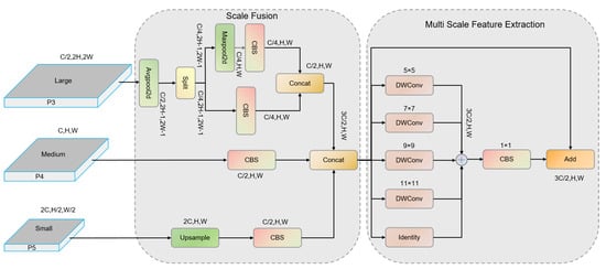 For the small-scale feature map, an upsampling operation is first applied. This step increases the spatial resolution, allowing the feature map to capture more detailed spatial information, which is beneficial for subsequent feature fusion. Following the upsampling, a convolution is employed to modify the channel dimensionality while keeping the spatial dimensions unchanged. This adjustment aligns the feature map’s channel count with those of other scales, making it more compatible for fusion. Upon completion of these operations, the processed small-scale feature map has a final size of . The mathematical formulation of this procedure is expressed as follows: