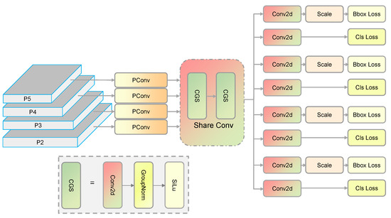To address the aforementioned issues, we have designed a new detection head structure called the lightweight multi-scale shared detection head (LMSHead). Its structure is shown in Figure 3. The design begins with the application of partial convolution (PConv) [32] to extract features from multi-scale feature maps’ output by the neck module. In PConv, standard convolution operations are applied only to a subset of input channels for spatial feature learning, while the remaining channels are passed through without modification. This mechanism enables enhanced feature extraction capability while maintaining low computational complexity. After that, a set of feature-sharing convolutional layers is used, which is iteratively used in each detection head. By sharing the convolutional layers, the model can further integrate the information between different detection layers to improve the robustness of feature extraction and reduce the number of parameters, and since the dataset is shared, the features at different scales can share the same object, which solves the problem of uneven distribution of objects at different scales and expands the data volume. The inner part of shared convolution consists of Conv, GroupNorm, and SiLU. Compared with batch normalization, GroupNorm overcomes the limitation of batch normalization in a small batch and distributed training and, at the same time, provides a more stable training process and a better generalization ability, assuming that the number of channels C is divided into G groups. The normalization calculation for each group is shown in Equation (8), where and are the mean and variance of each set of channels, and is a small constant to prevent division by zero errors from occurring.
