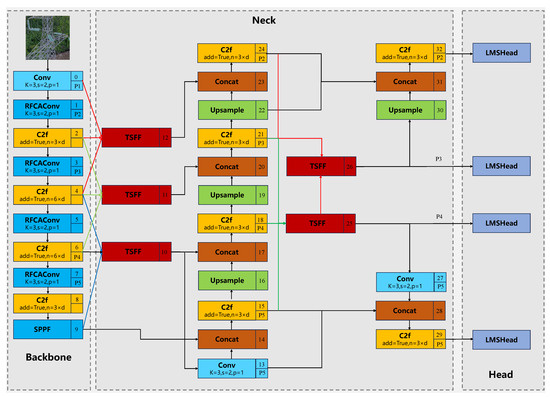 YOLOv8, one of the most widely used object detection algorithms, is known for its fast detection speed and relatively low computational complexity. Building upon YOLOv8, this paper introduces RML-YOLO, an improved algorithm that integrates MSFENet, LMSHead, and RFCAConv to enhance its performance, particularly in detecting insulators in complex environments. The overall structure of RML-YOLO is depicted in Figure 5. In the backbone network, the original convolutional layers of YOLOv8 are replaced with RFCAConv, which aggregates features with different receptive fields. This modification enables the model to effectively capture features from various locations, thereby enhancing its capability to detect insulators in complex background environments. In the neck layer, this study employs MSFEPNet, where the TSFF module is utilized to fuse features from the P1–P5 layers extracted by the backbone network, generating three feature maps of different scales: p2, p3, and p4. Unlike the traditional FPN structure in YOLOv8, which only upsamples small-scale feature maps, MSFEPNet incorporates abundant semantic information from large-scale feature layers (P1 and P2), significantly improving the detection performance for small objects.To ensure that the feature maps fed into the detection head retain rich detailed features, the TSFF module is also applied to the P2–P5 layers of the neck, resulting in two additional feature maps of different sizes: p3 and p4. The P2 and P5 layers are directly fused and processed. Finally, the fully fused multi-scale feature maps (P2–P5) in the neck are input into the detection head for final detection. Specifically, the P2 layer, containing abundant spatial information, is particularly advantageous for small object detection. The four different scale feature maps enhance the model’s multi-scale detection capabilities.
