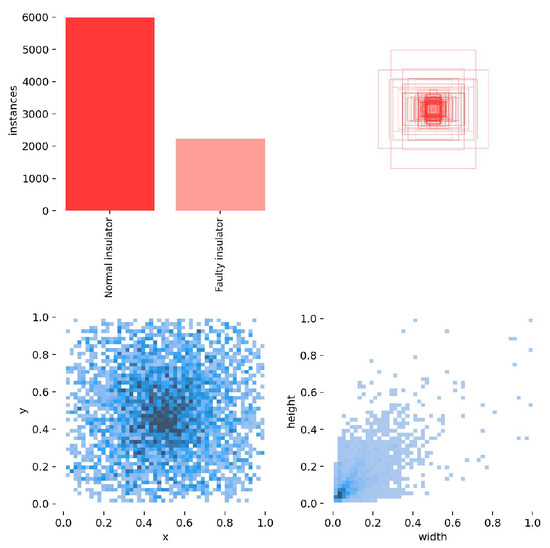 The detailed information of the dataset is shown in Figure 7, where a represents the number of labels for normal and defective insulators in the dataset, with the number of normal insulators being much higher than the number of defective insulators; b represents the size of the bounding box, indicating that there are more small- and medium-sized target boxes; c represents the center coordinate distribution of the bounding box, indicating that the bounding box distribution is relatively uniform; and d represents the aspect ratio of the target relative to the entire image. It can be seen that the scattered points in the lower-left corner are denser, indicating that there are more small- and medium-sized targets in the dataset.
