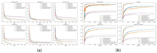 All experiments were conducted on the Windows 10 system, which was equipped with Intel Xeon Bronze 3104 CPU@1.70 GHz, 12 GB NVIDIA GeForce RTX 3060 GPU, Python 3.9, CUDA 12.1, and PyTorch 2.1.0. YOLOv8 is used as the base model, and the optimizer defaults to SGD. Other parameter settings are the same. Figure 8a shows the loss plots of RML-YOLO and YOLOv8 trained on three different datasets. It can be seen that the training and validation losses of all models continue to decrease with the increase in iteration times. Among them, the SFID dataset has the fastest loss reduction rate and tends to stabilize at 100 epoch without overfitting problems. Figure 8b shows the training results of RML-YOLO and YOLOv8 on three different datasets. It can be seen that, on the SFID dataset, mAP50 has become extremely stable and tends to approach 1 after 50 epoch, while mAP50-95 also tends to stabilize at 100 epoch without overfitting. Therefore, setting the training epoch of the SFID dataset to 100 is a more appropriate choice in the article. On the UID and VISDrone2019 datasets, accuracy and recall, as well as mAP50 and mAP50-95, begin to stabilize after 250 epoch, and no overfitting occurs at 300 epoch. Therefore, the training epoch on the UID and VISDrone2019 datasets are set to 300.