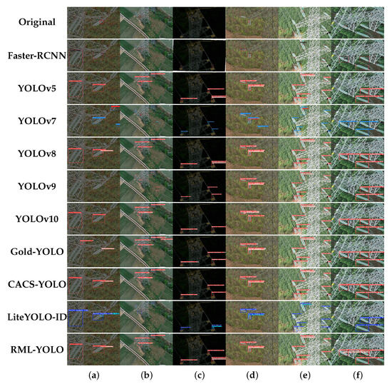 In Figure 10b, the main challenges include complex backgrounds and small object. Ultimately, only RML-YOLO, YOLOv10, and CACS-YOLO successfully identified all object without false detections. Faster-RCNN, YOLOv7, YOLOv9, and Gold-YOLO all produced false positives by misclassifying background weeds as insulators.