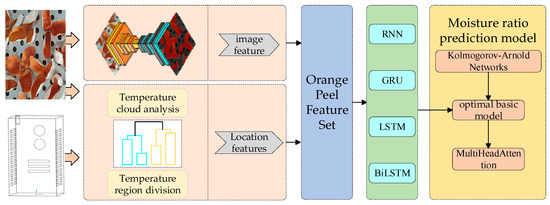 To address these challenges, we propose a novel multimodal fusion strategy that combines CFD-derived airflow and temperature fields with image-based features for moisture prediction. This study hypothesizes that combining visual features with airflow simulation data in a multimodal framework will significantly improve the accuracy of moisture prediction during drying. Central to our approach is the integration of a KAN with a BiLSTM. A semantic segmentation model based on VGG-UNet extracts microscopic features, such as tangerine peel color and texture [16], while finite element analysis (FEA) quantifies the spatial heterogeneity of airflow velocity and temperature distribution inside the drying chamber. This fusion strategy overcomes the limitations of traditional single-modal models. Ultimately, this model provides a valuable reference for the design of efficient drying processes. Therefore, this study aims to propose a Kolmogorov–Arnold network bidirectional long short-term memory (KAN-BiLSTM) neural network model to enhance input feature representation and develop a more accurate predictive model for the tangerine peel moisture ratio.