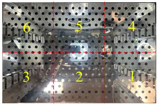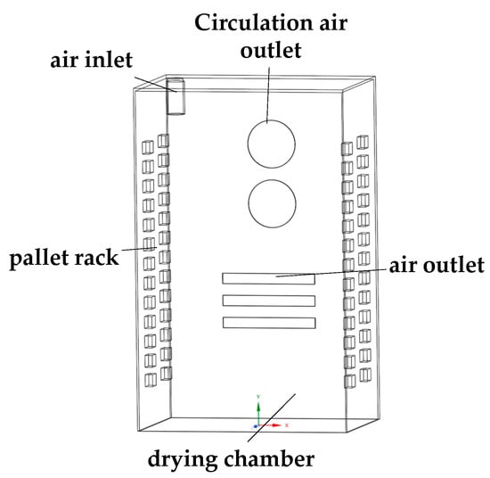 For this study, the QHX-1800BE artificial climate test chamber (manufactured by Changge Mingtu Machinery Equipment Co., Ltd., Guangzhou, China) was used as the experimental drying chamber. An air inlet with a radius of 50 mm was located in the upper left portion of the chamber, and two circulating fans were installed in the central region, each with a tuyere radius of 160 mm. The physical model of the drying chamber is presented in Figure 3.