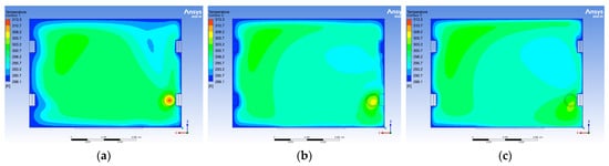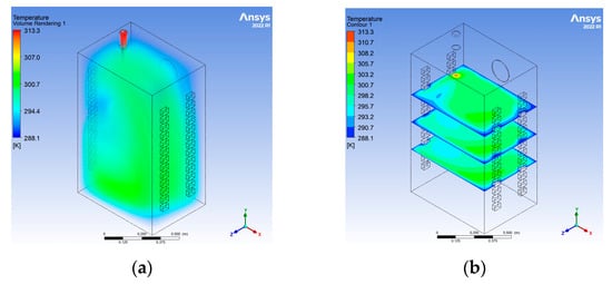 For the boundary conditions, a velocity inlet was implemented, with the inlet direction set perpendicular to the boundary and the velocity distributed uniformly. The wind speed was fixed at 0.5 m/s, and the turbulence intensity was estimated to be 3.8% using an empirical formula [10]. The inlet temperature was maintained at 313.15 K (40 °C), and a pressure step of 12 Pa was applied for the circulating fan. The outlet was defined as a free outflow boundary to ensure that all hot air exited the chamber completely. Solid walls were treated with a non-slip condition, and their temperature was set to 25 °C. The coordinate system was configured with the center of the bottom surface of the drying chamber as the origin. Figure 4 shows the volume rendering and temperature cloud distributions on the planes at y = 0.8, y = 0.535, and y = 0.35 as calculated by Fluent, while the top views of these planes are depicted in Figure 5. The velocity inlet was selected as the boundary condition. The inlet direction is perpendicular to the boundary and evenly distributed. The wind speed was set to 0.5 m/s, and the turbulence value was estimated to be 3.8% by the empirical formula [10]. The inlet temperature was 313.15 K (40 °C), and the pressure step of the circulating fan was 12 Pa. The outlet condition was set to free outflow, and the hot air at the outlet flows completely from the outlet. The solid wall used a non-slip condition, and the wall temperature was 25 °C. The coordinate axis was set as shown in the figure, and the center of the bottom surface of the drying chamber was the origin. The volume rendering diagram and the temperature cloud distribution on the surface of y = 0.8, y = 0.535, and y = 0.35 calculated by Fluent are shown in Figure 3. The top view of each plane is shown in Figure 5.
