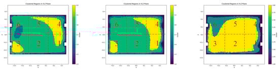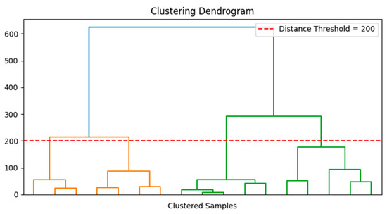 The clustering dendrogram illustrates the sample grouping based on Euclidean distances. A distance threshold of 200 (red dashed line) was applied to truncate the dendrogram, resulting in the identification of three distinct clusters. But, in the actual material board, the same category was distributed on both sides of the center. So, we divided the material board into six regions; you can divide the temperature region on the material board, the results of the division shown in Figure 9 and Figure 10.