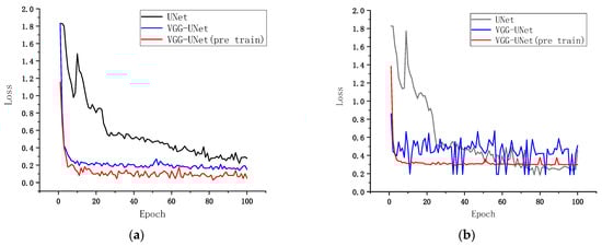 This section compares the performance of U-Net, VGG-UNet, and pre-trained VGG-UNet in the tangerine peel image segmentation task through systematic experiments, with a particular focus on training dynamics and loss convergence characteristics. Prior to model training, all input images were resized to a fixed resolution of 512 × 512 pixels to ensure consistency in input dimensions. All models were trained for 100 epochs using the same hyperparameters (initial learning rate = 0.0001 with the Adam optimizer) on a dataset comprising 1680 high-resolution citrus epidermis images (1344 for training and 336 for validation). The evaluation results in terms of MIoU and loss are presented in Table 7.