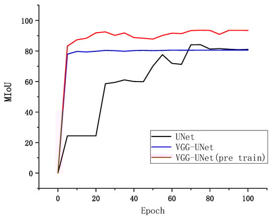 Figure 11a,b illustrate the convergence rate and stability during training and validation, respectively. Notably, the pre-trained VGG-UNet demonstrates a significantly superior initialization and feature representation capability. Its initial loss at epoch 1 was 1.15, which is approximately 67% and 68% lower than that of the randomly initialized VGG-UNet (1.82) and basic U-Net (1.83), respectively (see Figure 11). Moreover, the MIoU of the pre-trained VGG-UNet was 93.58%, exceeding that of the randomly initialized VGG-UNet (80.54%) and basic U-Net (84.17%) by 13.04 and 9.41 percentage points, respectively (see Figure 12). These results indicate that the use of pre-trained weights effectively alleviates the cold start problem, particularly by capturing general texture features in the shallow convolutional layers. To assess the robustness of the models, we further report the 95% confidence intervals (CI) of MIoU across repeated runs. The pre-trained VGG-UNet showed a narrow CI of [89.482%, 90.069%], indicating high reliability and stability. In contrast, the randomly initialized VGG-UNet had a wider CI of [79.862%, 80.450%], and the basic U-Net showed the lowest robustness with a CI of [52.892%, 73.231%]. We computed the F1-score as a pixel-level performance indicator. As shown in Table 7, the pre-trained VGG-UNet achieved the highest MIoU of 93.58% and a corresponding F1-score of 0.967, significantly outperforming both the basic UNet (F1 = 0.914) and randomly initialized VGG-UNet (F1 = 0.892). These findings underscore the advantage of pre-trained feature extractors in improving both accuracy and consistency of the segmentation performance.