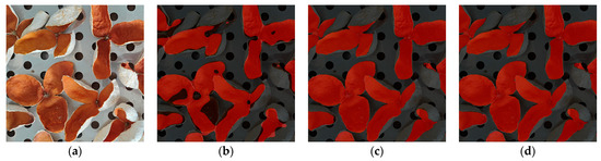In particular, the segmentation accuracy in the tangerine peel–background transition region was markedly superior to that of the other models (see Figure 13). The visualization in Figure 13d demonstrates that the pre-trained model effectively suppressed the edge fragmentation caused by wrinkle shadows, with segmentation contours that closely match the manual ground truth. This performance advantage is attributed to the multi-directional edge filtering capability provided by the VGG16 pre-training, which enhances the model’s ability to accurately characterize irregular boundaries.