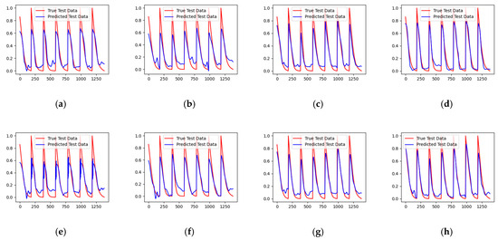 The actual values and predicted values of test data using different architectures. (a) RNN + Region, (b) GRU + Region, (c) LSTM + Region, (d) BiLSTM + Region, (e) RNN, (f) GRU, (g) LSTM, and (h) BiLSTM.