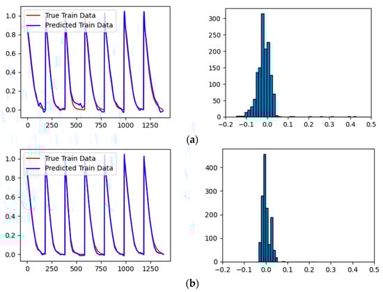 Figure 14 compares the actual values and predictions for test data using the four architectures (RNN, GRU, LSTM, and BiLSTM), with and without regional data. Each comparison diagram displays seven change curves that start simultaneously with the same initial moisture ratio. Among these, the red curves represent the true test data, while the blue curves correspond to the predicted values obtained from the model.