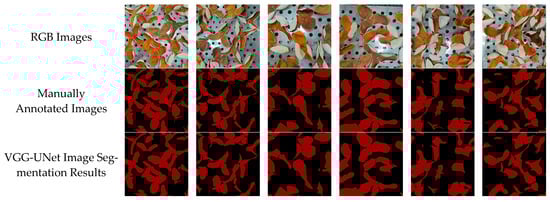 To further validate the segmentation performance of the VGG16-UNet model, tangerine peel images from the test set were segmented and visually compared, as shown in Figure 13. Overall, despite the complex background, the VGG16-UNet model achieved high consistency in multi-target measurements.