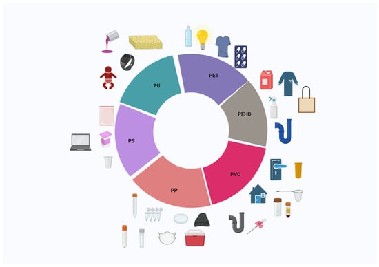 Plastics are man-made materials created through the polymerization process of monomers derived from oil or gas [17]. It is estimated that there are approximately 45 different types of plastics that exist worldwide. The most commonly used organic polymers include polyethylene terephthalate (PET), polyethylene high-density (PEHD), polyvinyl chloride (PVC), polypropylene (PP), polystyrene (PS), and polyurethane (PU). Plastics such as PS, polypropylene (PP), polyethylene (PE), and expandable polystyrene (EPS) are commonly found in oceans and river sediments and on beaches. At ground level, PE and PP are the most common polymers, followed by PET and PVC. Polyesters, polyurethane, and polystyrene are detected less frequently in unperturbed sea surface samples [18,19]. Figure 1 represents the main types of plastics and the products obtained from them.