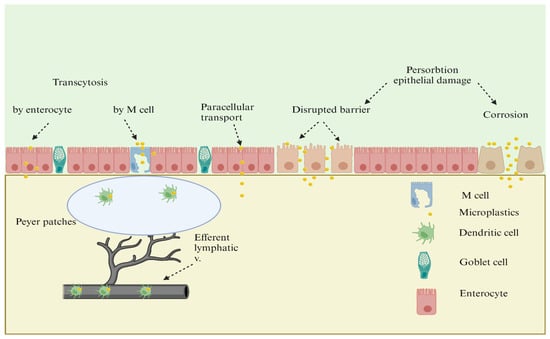 Conversely, they possess broader (micro-)folds and a more delicate luminal surface, facilitating the rapid absorption of particles within the intestine [82]. Figure 2 shows the pathologic pathways through which MPs enter the gut.