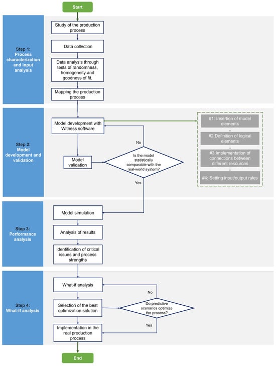 Discrete-event simulation is a computer modeling technique that offers an intuitive and versatile approach to reproducing the dynamic behaviors of complex systems [87]. This methodology is implemented in Witness, an interactive visual simulation software used in this research to reproduce the production process [88]. Model construction in the Witness Horizon simulation environment is characterized by an iterative process featuring four macro phases. The research methodology that enabled the development of the digital model of the real production process is divided into several consecutive stages, as shown in Figure 2.