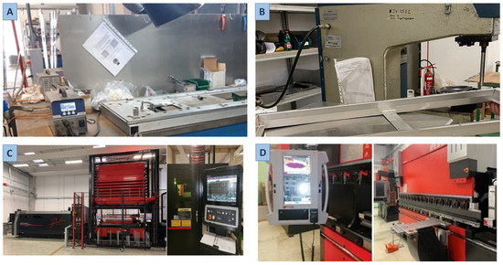 Figure 4 illustrates different activities in the production process. Photo “A” shows the spot welding applied to the doors, while photo “B” depicts the insertion phase of the inserts to which they are subjected. Photo “C” shows the laser cutting machine used to process the large aluminum sheets. Finally, photo “D” shows the press used to bend the sheets.