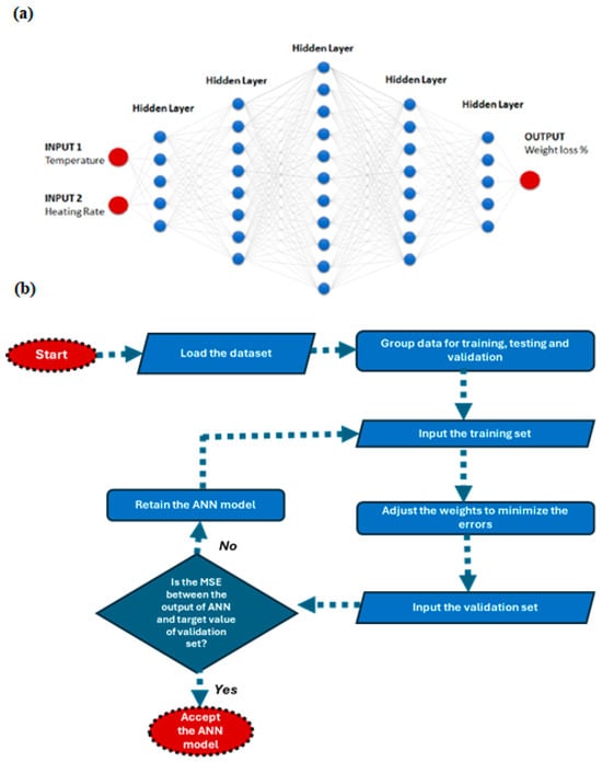 In the proposed ANN model, the input parameters—heating rate (°C/min) and temperature (°C)—were employed to predict weight loss (%) behavior. This study utilized over 7000 lines of experimental TGA data. Following standard practice, 80% of the dataset was allocated for training, while the remaining 20% was reserved for validation. During training and validation, the dataset was split according to its features and via random selection, respectively. The ANN architecture, along with its corresponding input and output parameters, is illustrated in Figure 2. Further details regarding the ANN configuration used in this study are provided in Section 3.2.