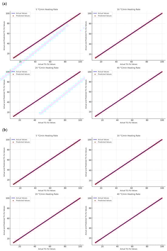 Figure 4a,b, below, compare the experimental data and model predictions for various heating rates in the chitosan and chitin datasets, respectively. In these figures, the x-axis represents the actual heating rate values, while the y-axis represents the predicted heating rate values. The results reveal a nearly perfect linear correlation between the actual values (blue points) and the predicted values (red points), indicating minimal prediction error []. The predicted values almost perfectly overlap with the actual data, demonstrating a well-trained model with strong generalization capabilities—especially if these results are obtained from a test set. The analysis results underscore the power of ANNs in predicting outcomes in thermal degradation experiments. It is evident that further weight loss data with different parameters can be realistically predicted using the experimental results obtained through ANN modeling.